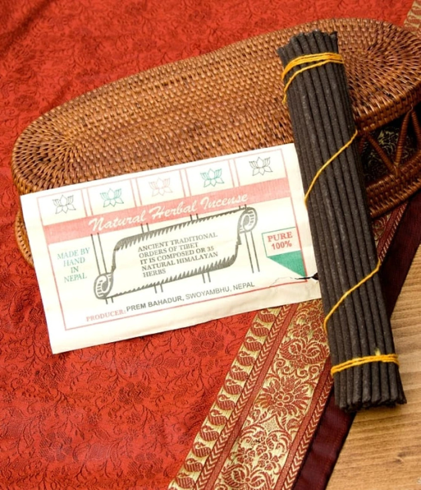 35種のハーブを伝統レシピで配合 ネパールやチベットに古くから伝わる伝統的な成分と配合で作られている特別なお香です。 このお香は特別なものなので、現地では場を清めたり、お祈りの時に使用されています。 もちろん、香りを楽しむために焚いても全く問題はありません。