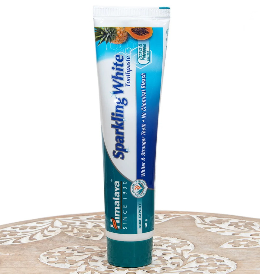 インドのアーユルヴェーダに基づいた歯磨きです。 こちらのSparkling White歯磨き粉にはインド古来の知恵から、パパイヤ酵素、歯ブラシの木、シナモン、クローブなどが配合されています。 日本の歯磨きとはまた違った歯磨き粉です。